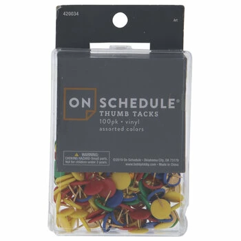 Put a pin in it with Vinyl Thumb Tacks. These classic metal tacks feature round shapes and vinyl coverings colored red, yellow, green, and blue. Perfect for memo boards and other crafts, these tacks will be your go-to attachment!